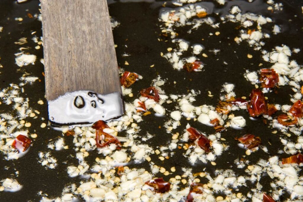 • When all the eggplant has been cooked, there should be a few tablespoons of oil left in the pan (if not, add around 3 tablespoons). Remove from the heat and add the chiles and garlic, stirring to cook in the residual heat. Cook until the garlic has just begun to soften, but do not allow it to brown or burn.