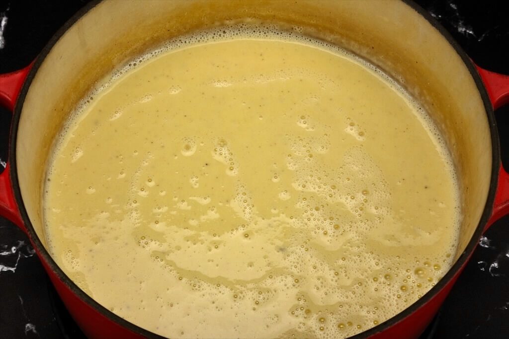 - In a small bowl, whisk the egg yolks together. Add two ladlefuls of the base into the egg yolks, whisking the yolks constantly to temper the mixture. Once tempered, return the mixture to the base.