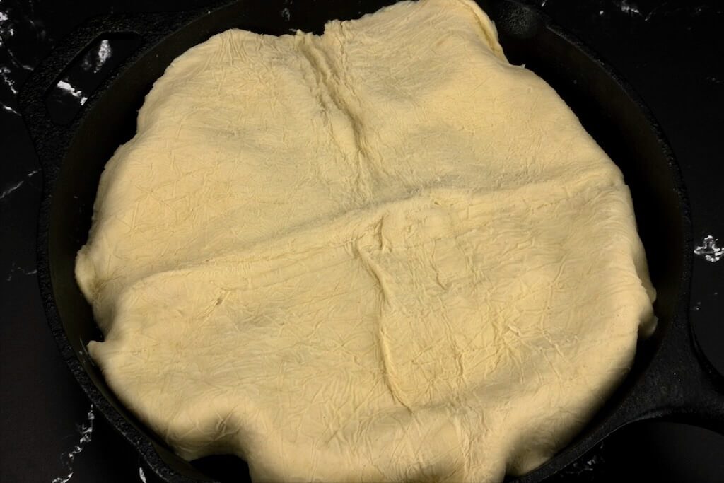 - Select a heavy, medium skillet (I like cast iron) and roll out your puff pastry to about 1” larger than the circumference of the pan, trimming the edges to create a large circle. Wrap the pastry well in plastic wrap, and store it in the refrigerator until needed.