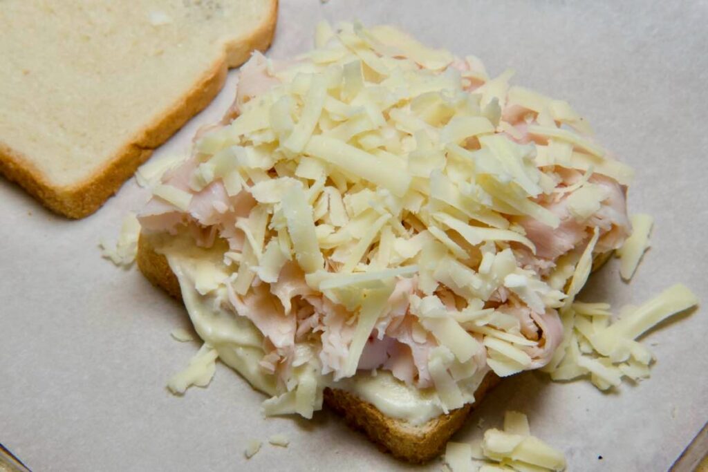 - Lay two slices of bread on your prepared sheet pan. Spread each slice generously with bechamel sauce. Top with sliced meat, and sprinkle each with ¼ of the shredded Gruyère. Add the top slice to each, and cover generously with bechamel, going all the way to the sides (this will prevent the edges from burning). Divide the remaining Gruyère over each sandwich, and top with the grated Parmigiano-Reggiano cheese.