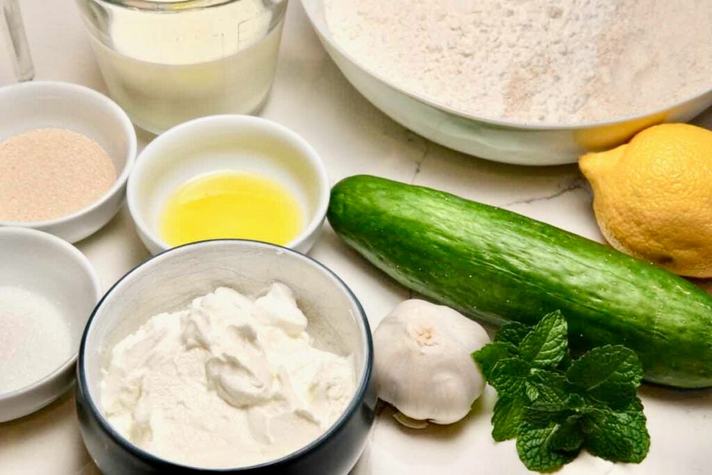 Whenever I am eating out and I see house-made flatbread on the menu, I just have to order it. There is nothing quite like warm, freshly-made bread—it is one of life’s great pleasures. And whether it’s naan, pita, or focaccia, freshly baked bread practically begs for something to dip into. Like for instance, a cool, garlicky tzatziki dip that balances the warmth with a refreshing tang.