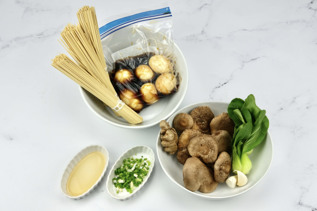 - When ready to serve, divide the noodles and bok choy among 4-6 serving bowls. Top each with chopped green onions and 2 soy egg halves. Pour hot broth over each portion, and serve.