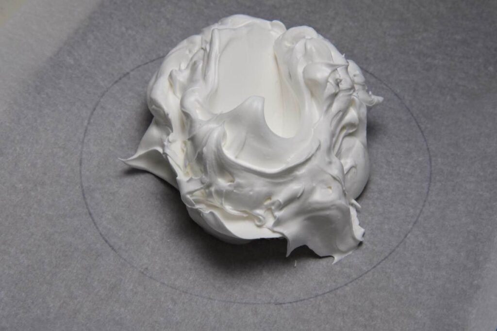 • Pile the meringue into the marked circle on the sheet pan. Shape into a high mound with a shallow well in the center, with high sides to hold the filling.