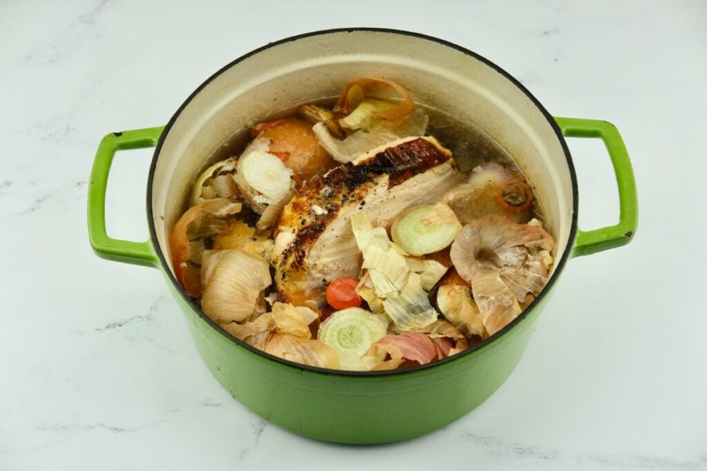 - 1-1 ½ quarts (1-1 ½ liters) water per pound of poultry, or enough water to cover your bones and vegetables in a large stockpot